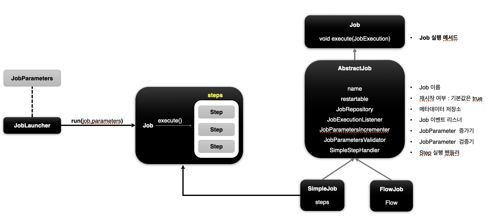 - 배치 Job 을 구성하기 위한 최상위 인터페이스이며 스프링 배치가 기본 구현체로 제공한다.