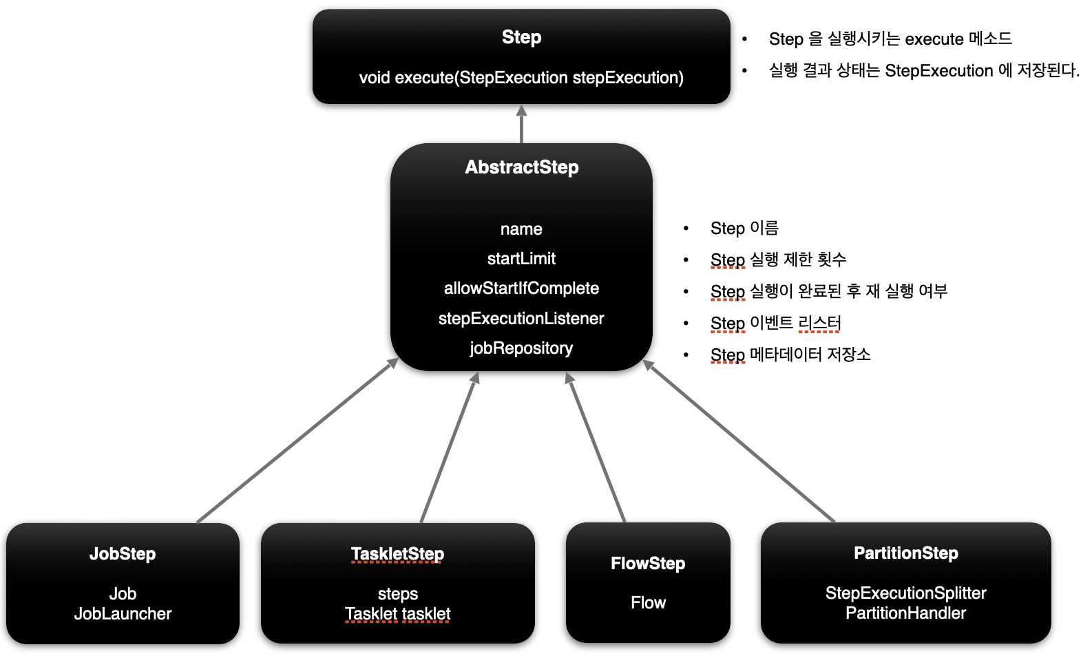 - Batch Job 을 구성하는 독립적인 하나의 단계로서 실체 배치 처리를 정의하고 컨트롤하는 데 필요한 모든 정보를 가지고 있는 도메인 객체