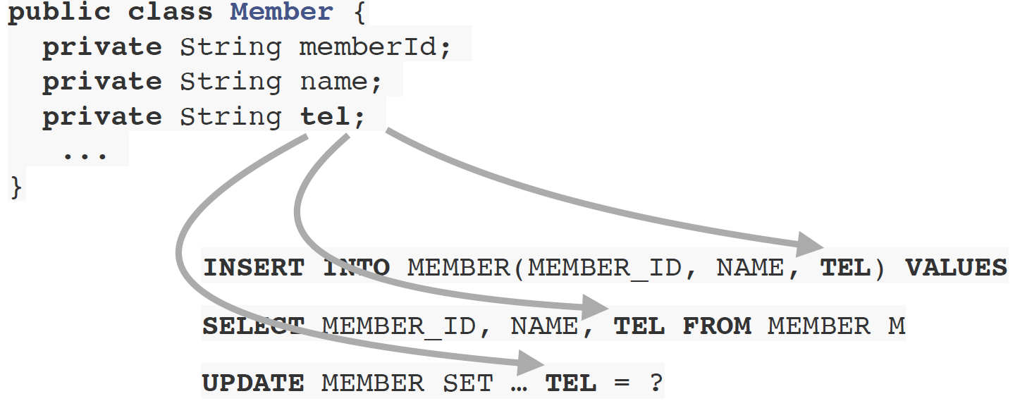 JPA의 경우 Member 클래스에 필드를 추가함으로 CRUD 쿼리 수정이 한번에 가능해짐.