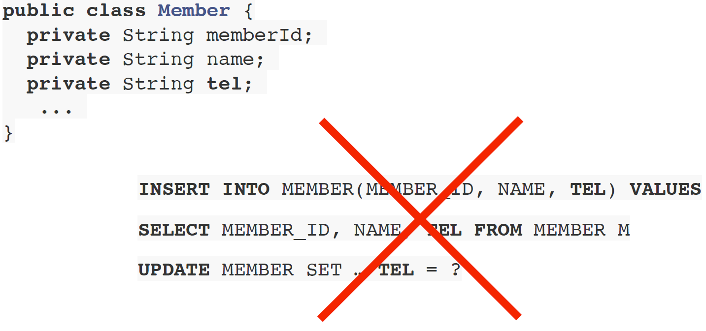 JPA의 경우 Member 클래스에 필드를 추가함으로 CRUD 쿼리 수정이 한번에 가능해짐.