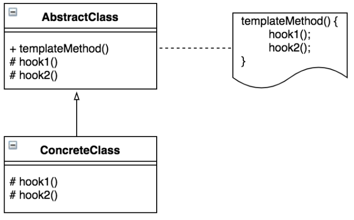 알고리즘의 구조를 메소드에 정의하고, 하위 클래스에서 알고리즘 구조의 변경없이 알고리즘을 재정의 하는 패턴이다. 알고리즘이 단계별로 나누어 지거나, 같은 역할을 하는 메소드이지만 여러곳에서 다른형태로 사용이 필요한 경우 유용한 패턴이다.