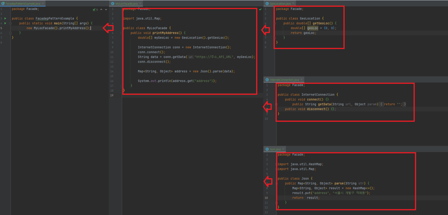 여러개의 객체의 메소드들이 섞인 과정을 하나의 메소드로 만들어 사용자로 하여금 Facade 뒤의 복잡한 과정에 관심을 없앤다.