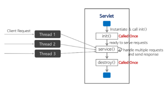 - 요청이 들어오면 Thread Pool에 있는 Thread가 서블릿의 service() 메서드를 호출한다.